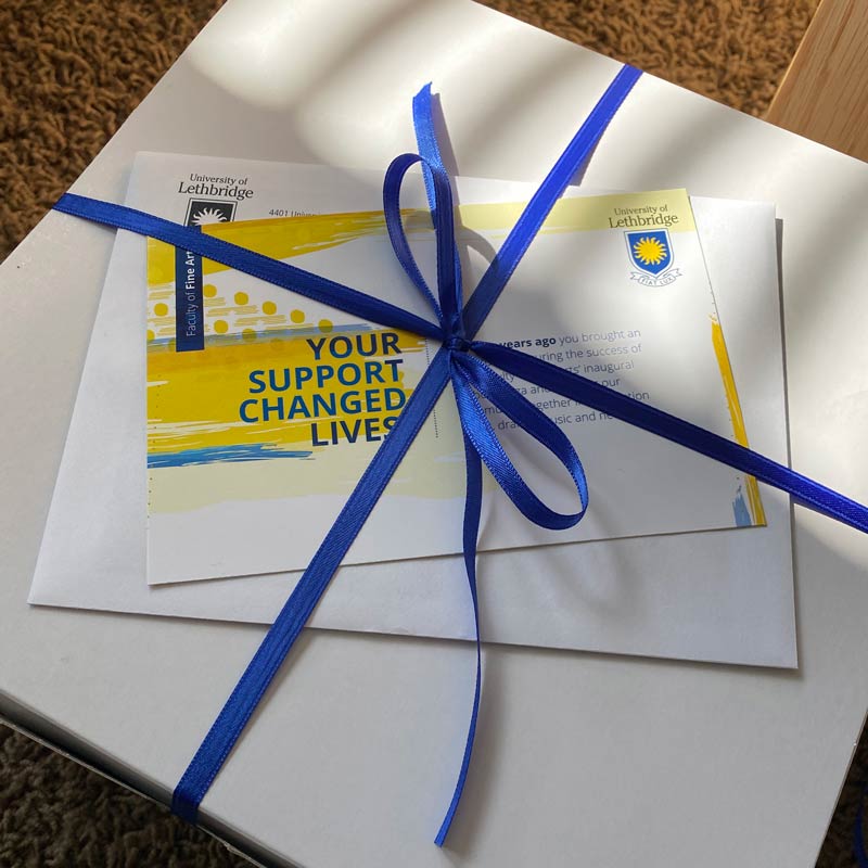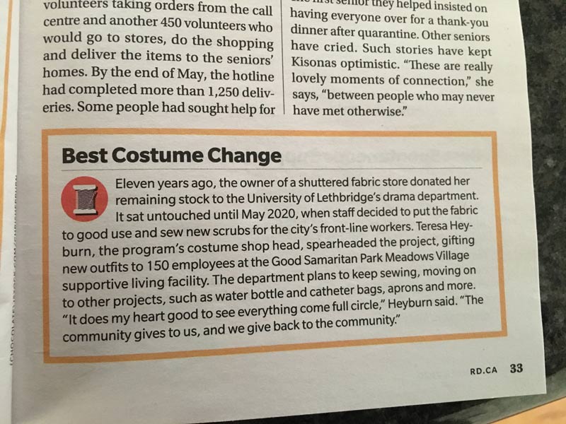 At the onset of the pandemic, I was given the heartwarming task of finding the good stories. I learned that the talented staff in the Costume Shop in the Faculty of Fine Arts were using donated fabric to sew scrubs and bags for healthcare workers. The story was picked up by media throughout Southern Alberta, leading the family of the fabric donor back to the Fine Arts. A follow-up story shared that the connection led to the granddaughter of the fabric donor, now a nurse, to receive a pair of scrubs sewn from her grandmother’s fabric. A segment of the story was picked up by Reader’s Digest.